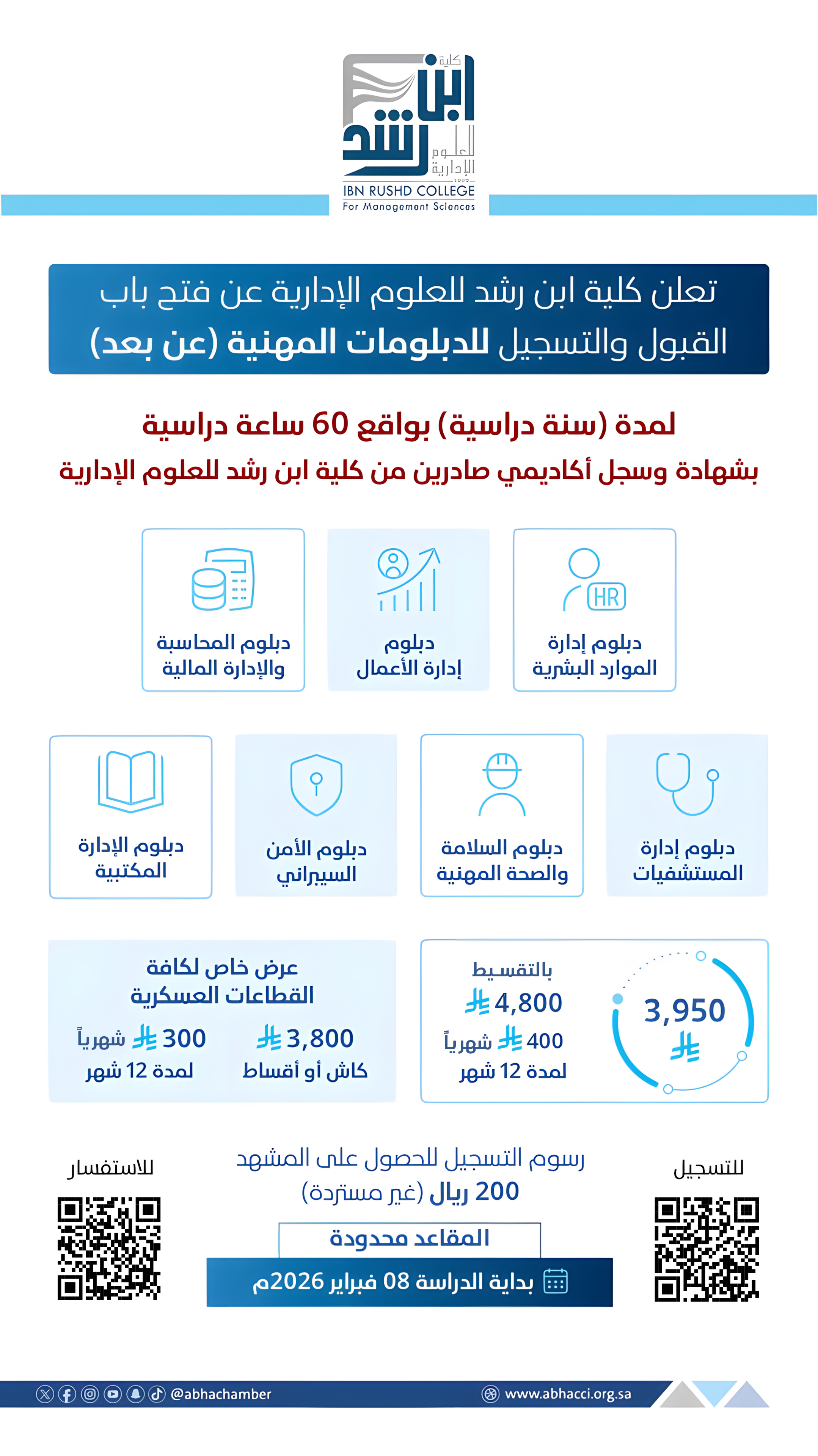 يُعلن مركز خدمة المجتمع بـ كليةابن رشد للعلوم الإدارية بالتعاون مع غرفة أبها عن فتح باب التسجيل وإعتماد عدة دبلومات مهنية عن بُعد لمدة سنة ، بواقع 60 ساعة دراسية ، متاح الدفع عبر التقسيط ويوجد عروض خاصة لكافة القطاعات العسكرية للتسجيل والاستفسارات عبر الباركود الموضح أسفل الإعلان